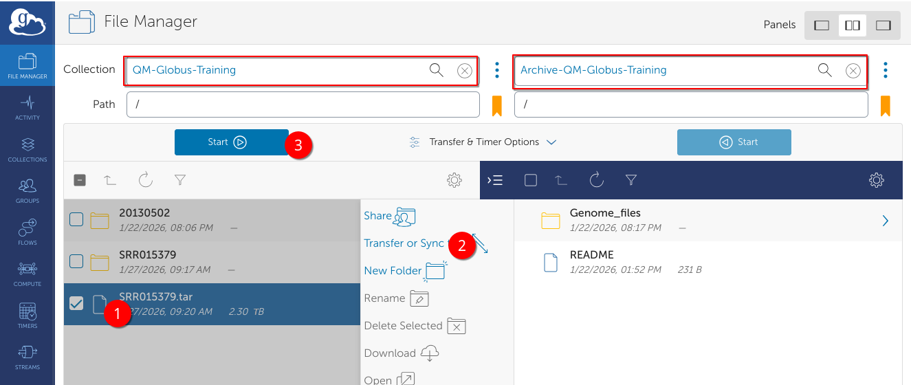 In the example below, a large tar file is being transferred from a collection on Apocrita called QM-Globus-Training to an archive called Archive-QM-Globus-Training.